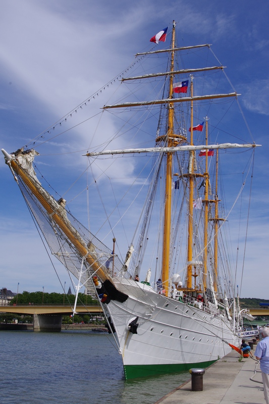 L’Esméralda, magnifique voilier école de la marine Chilienne est un quatre mats goélette à hunier, quatrième grand voilier du monde par sa longueur (113 m). Il a été construit à Cadix en Espagne, commencé en 1942. Un incendie à stoppé sa construction,il a été finalement terminé en 1952, puis donné au gouvernement Chilien le 15 juin 1954, en dommages de guerre.